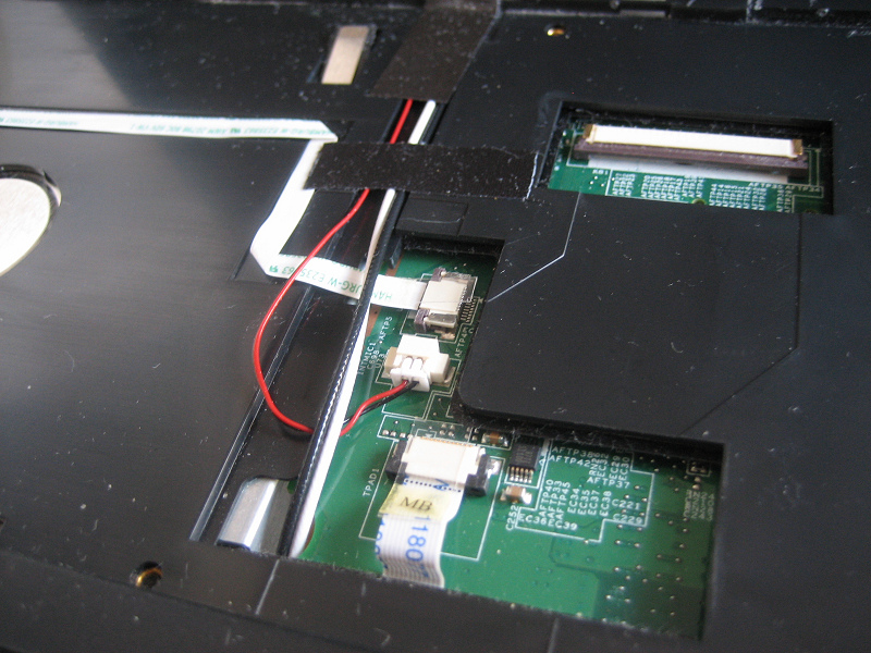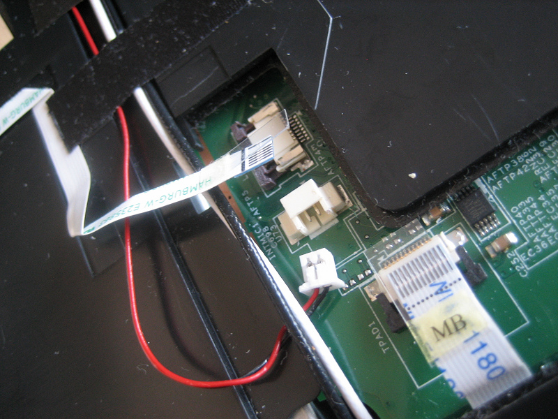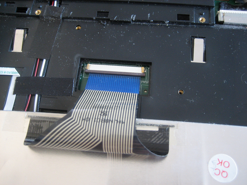 キーボードを持ち上げると裏に左写真の青いフラットケーブルがささっているのでこれを外すとキーボードが外れます。