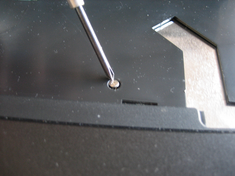 (失敗.....今回は、写真ではちょうど精密ドライバーグリップのキーボードと電源カバーの隙間を先にこじ開けてしまい、電源カバーのツメのいくつかを折ってしまいました。)