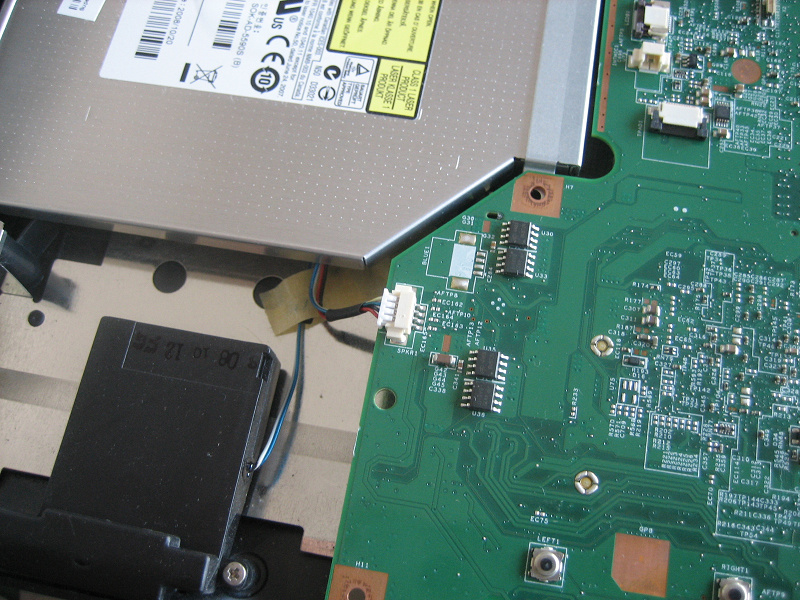 マザーボードを外すにはマザーボード右上のネジ1本(写真左)とコネクタ個(写真右)をはずします。