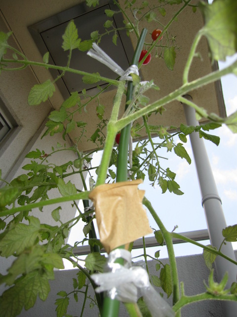 ところで、現在のトマトの木は写真のようにガムテープ補修跡がありますが、枯れるどころが枝の先には赤い実をつけています。