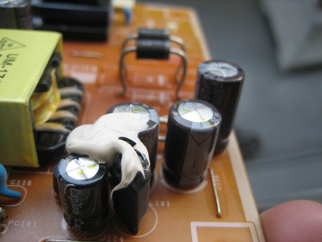 電解コンデンサ2個の頭が膨らんでいます。
