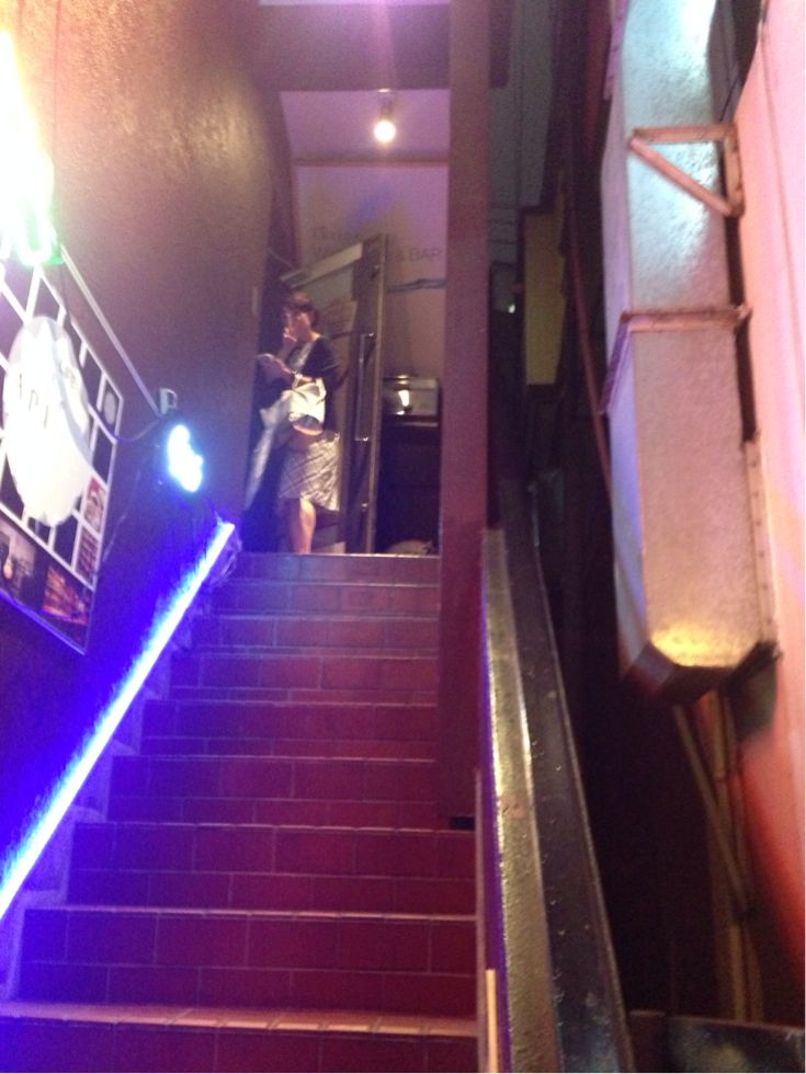 T女史は私をおいて先に階段をトコトコ上がります。紫色の電飾がちと怪しいなあ、ココ(~_~;)
