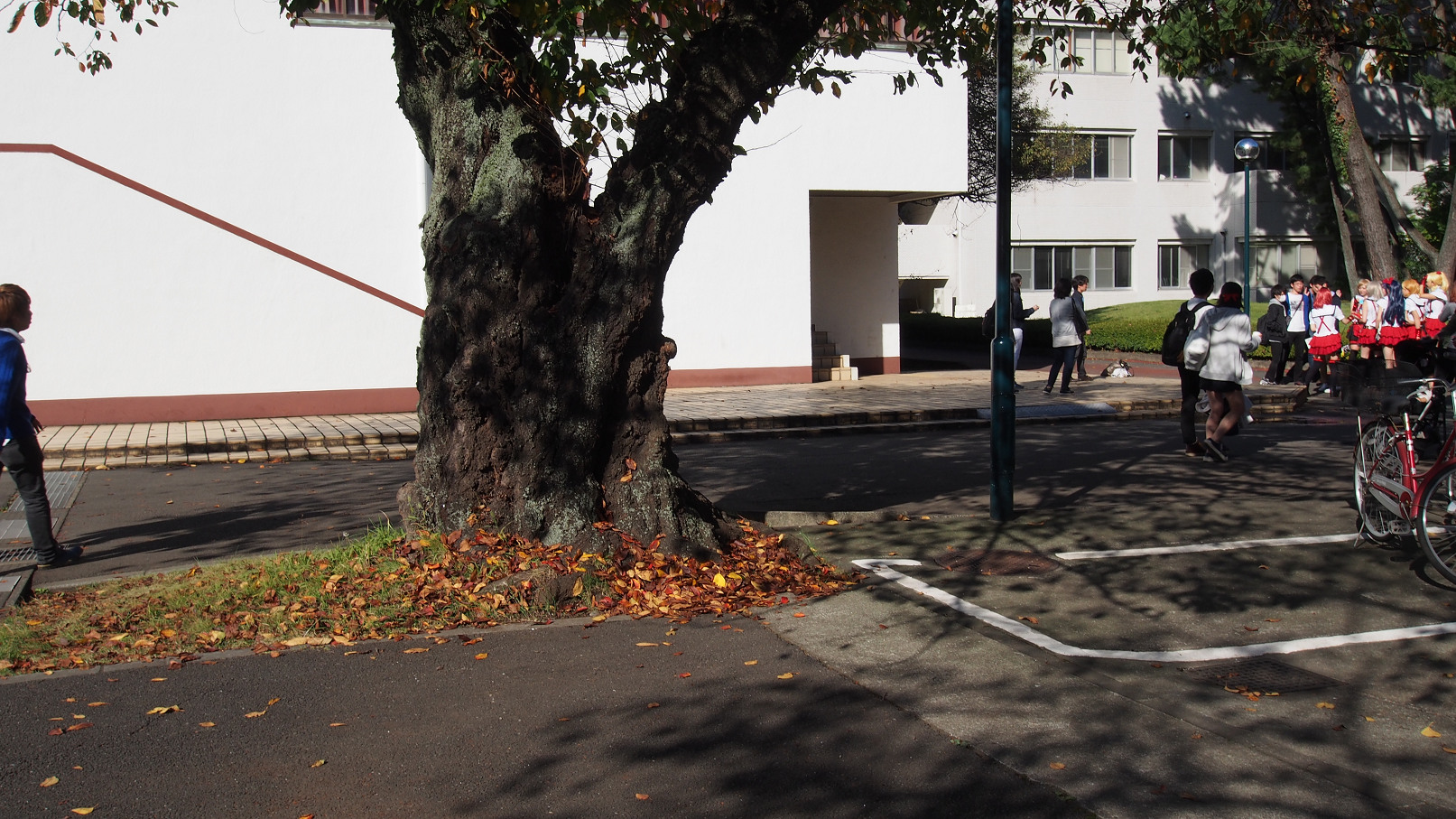 校門を入ってすぐにある掲示板の横で振り向くと、チッチがサリーのストーカー(笑)をはじめたところ。
