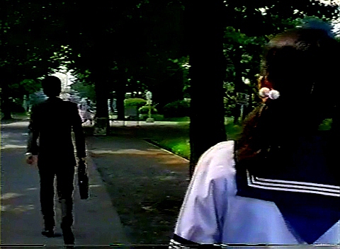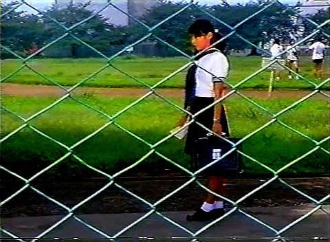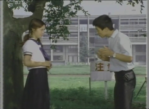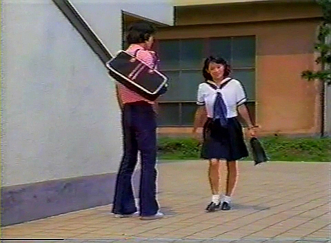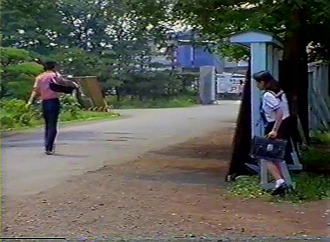 そこから校舎の方へ向かってグラウンドの手前の道へ出ると、山下君が不良女番長ノブコに声をかけたところ。