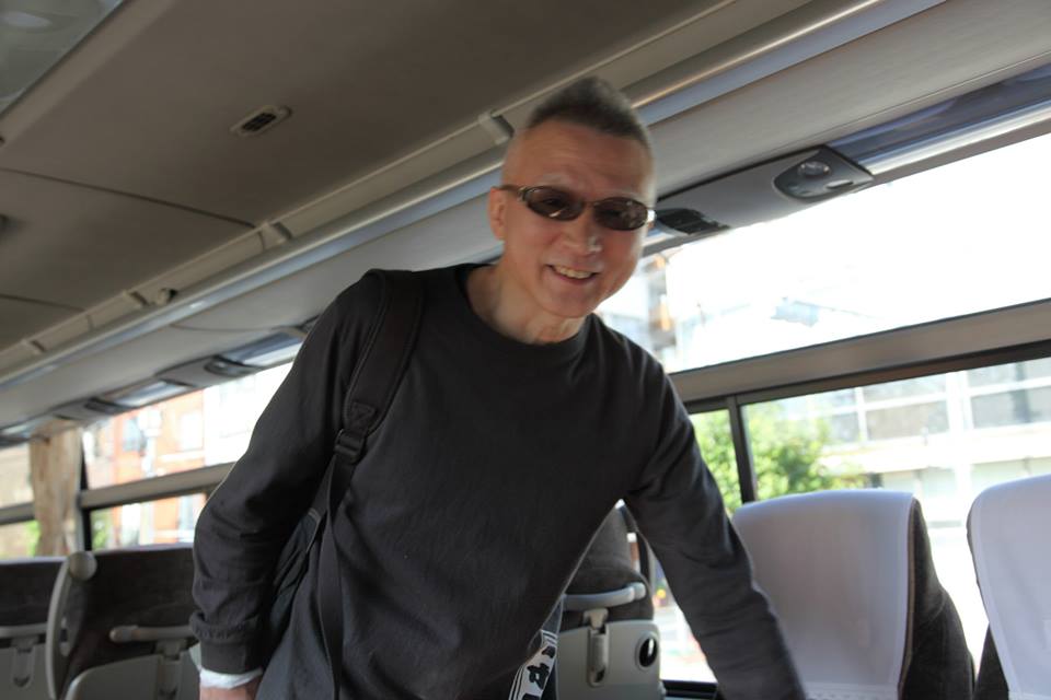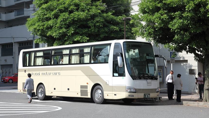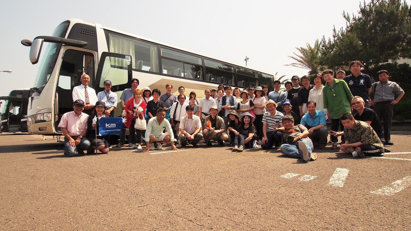 集合時間が近くなるにしたがって参加者が集まってきて、ワイワイ盛り上がっているとKMカラーのバスが到着。