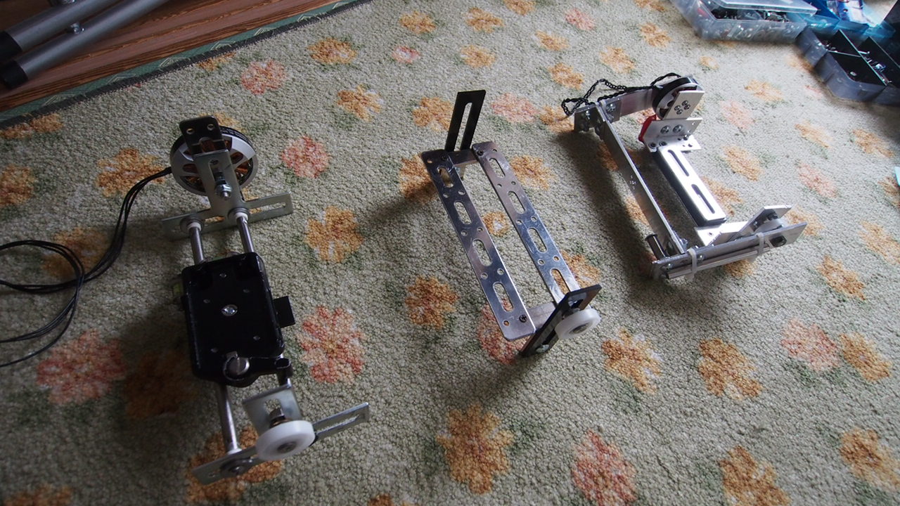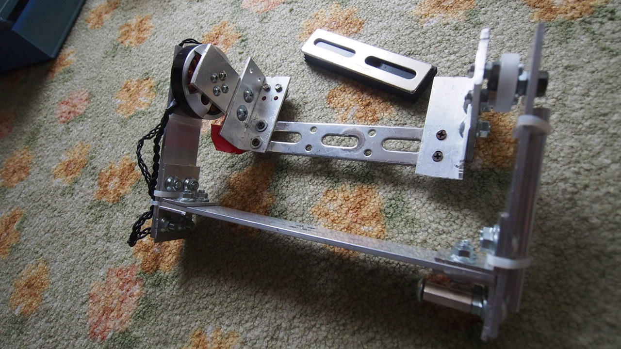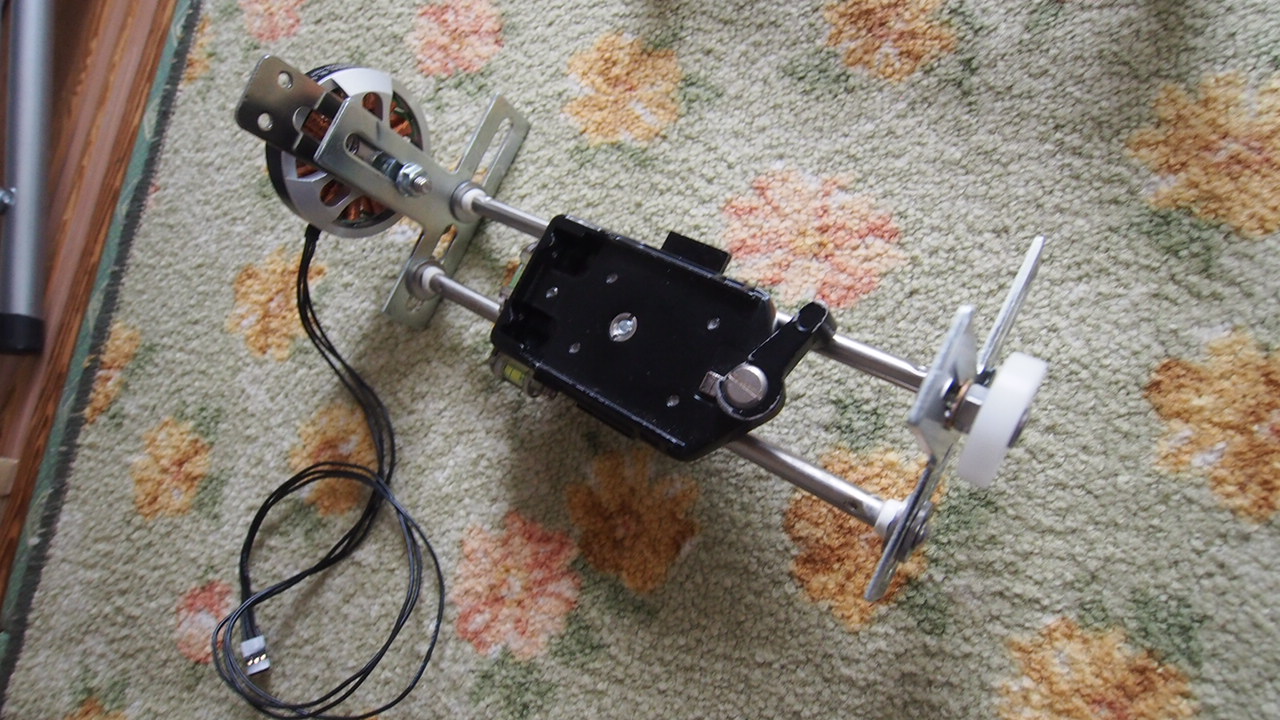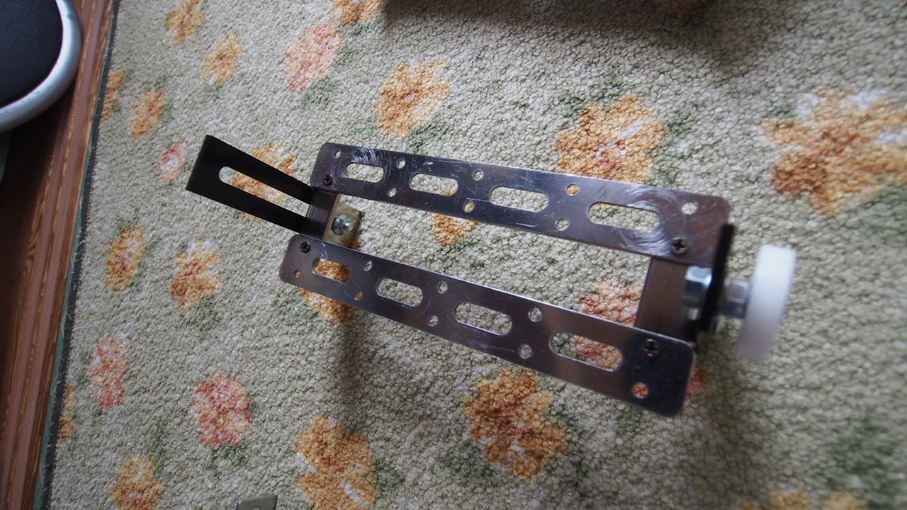 そこで上の写真のようにハンドルからL字金具をYAW軸モーターの下側へすべりこませ、モーターをサンドイッチする方式に変更しました。