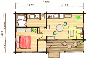 ログハウスメーカーtaloの平屋タイプHI-20の写真と間取り図です。(メーカーHPより)