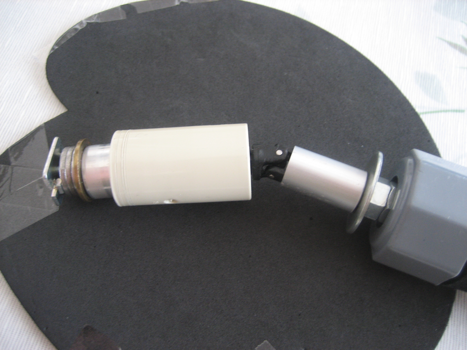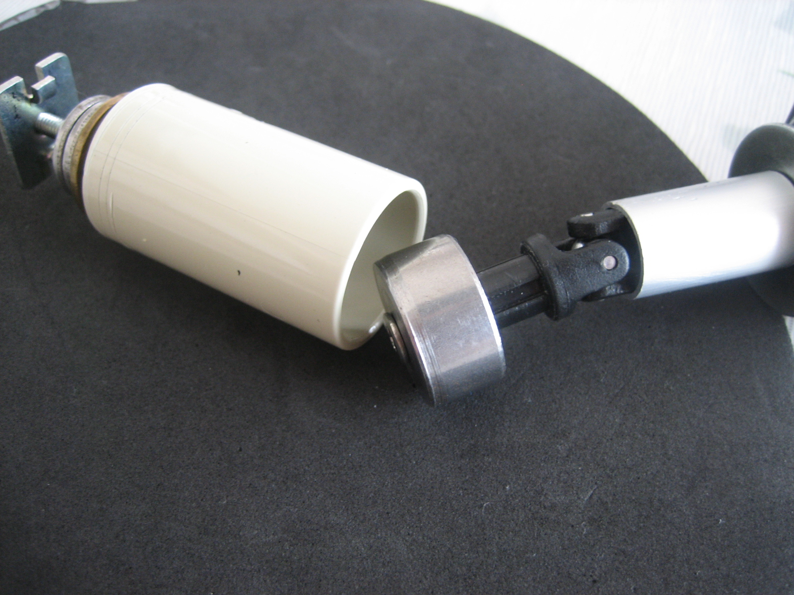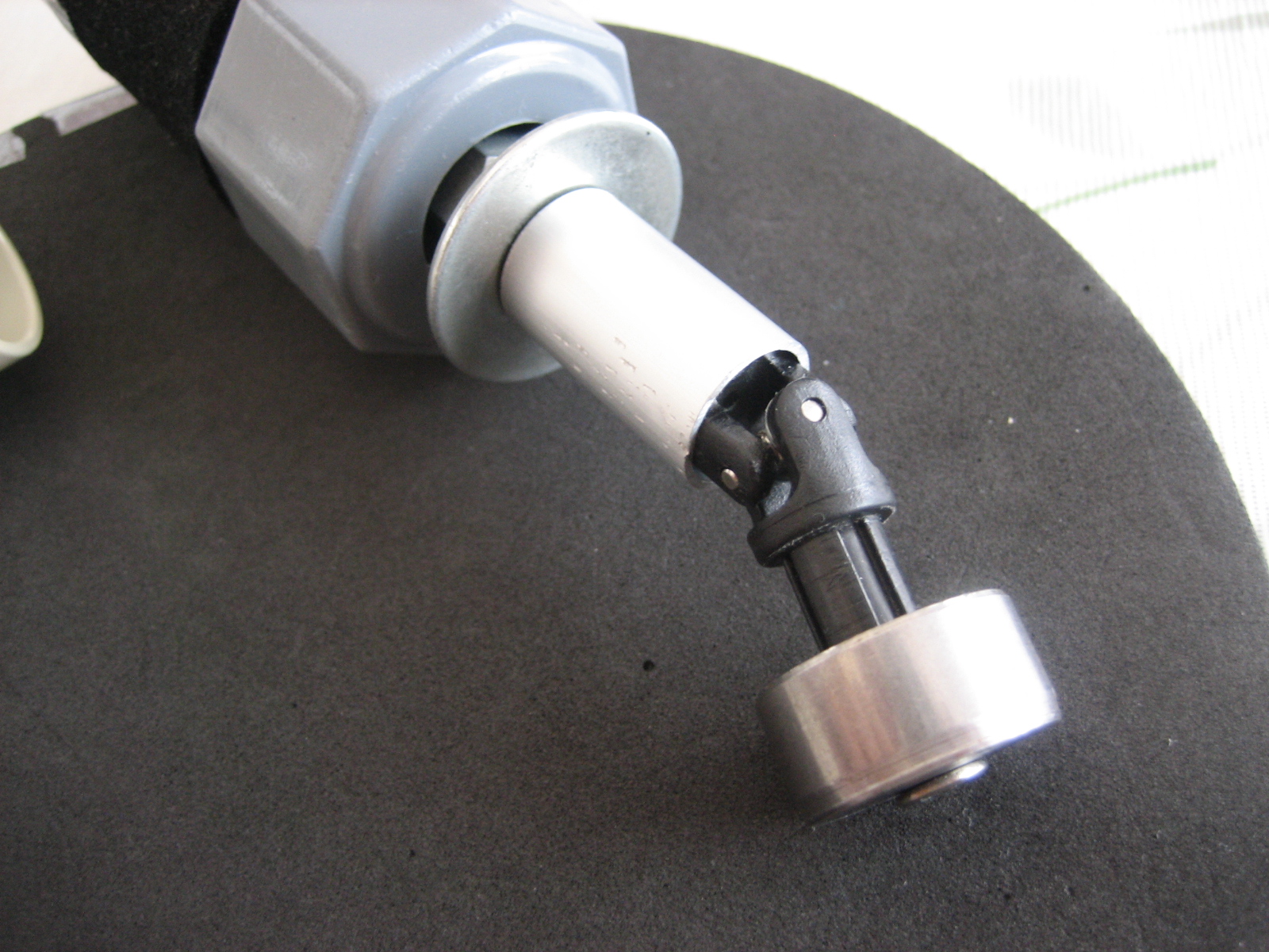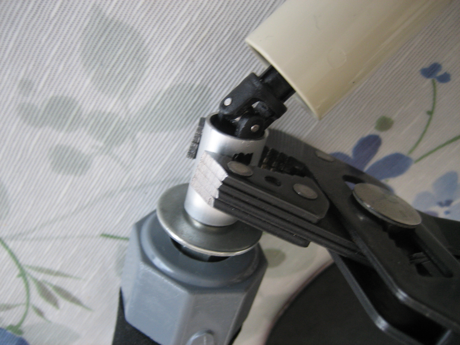 このユニバーサルジョイントはボールジョイント部が広がってガタツイているので、直径15mmアルミパイプをかぶせ、黒く塗った部分をペンチで押しつぶしてジョイント部のガタを解消