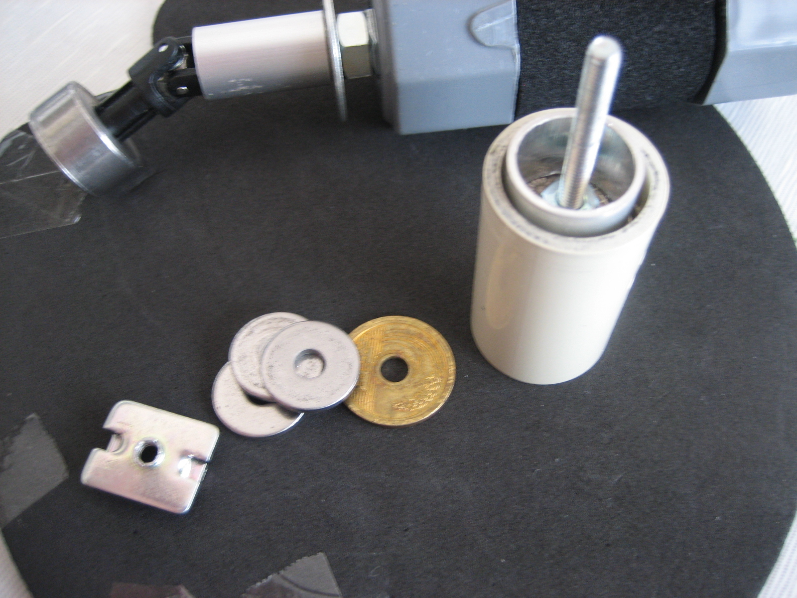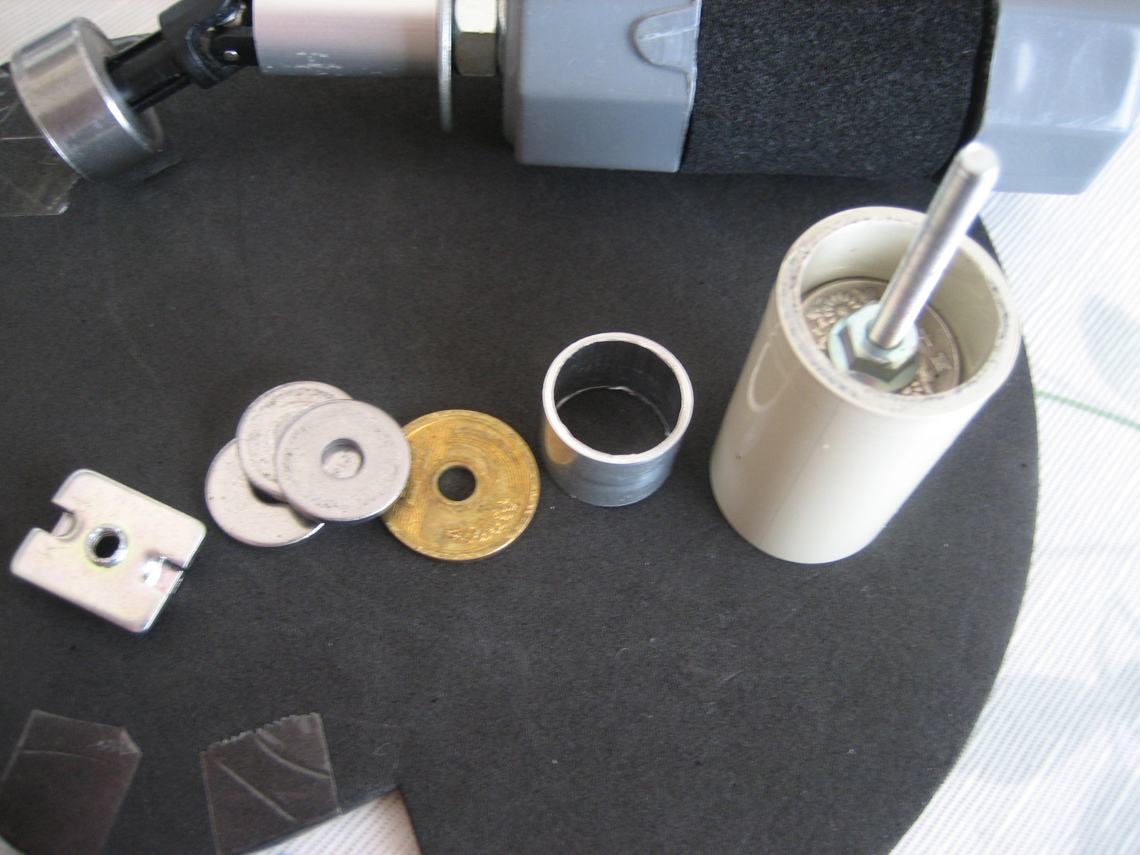 左から、四角ナット(M4)、厚ワッシャ(M5)、5円玉、アルミパイプ、ベージュ色プラ製パイプ(ガス用16プラパイプ、M4ネジ40mm、50円玉(2個)、M4ナット)