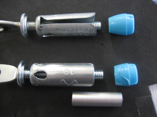 そこで、羽根が十分固定するくらい広がったところで、それ以上ノブが回転しないようにアルミパイプ(直径10mm、厚さ0.5mm 長さ34mm)を差込み、さらに空色のプラパーツの細い方を3mmほど削ります。