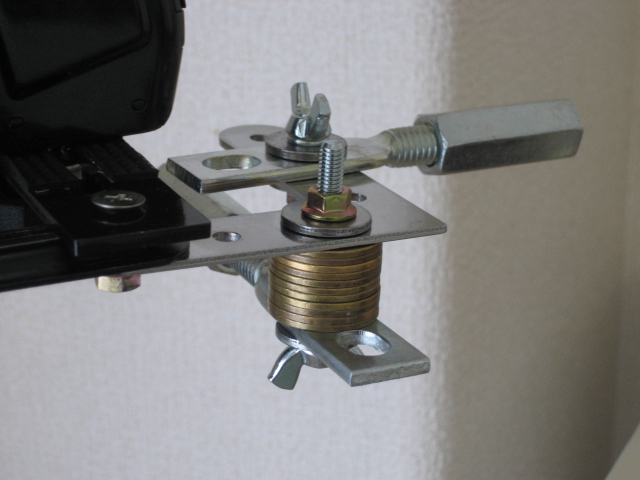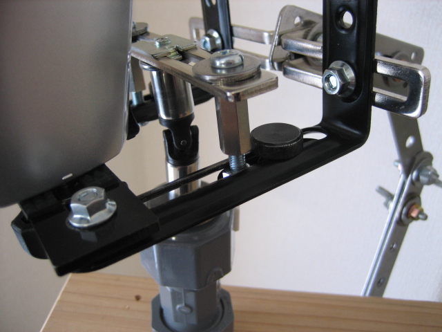 前後左右の微調整装置には羽子板ボルト。これをL字金具(ver1で使用)に取り付けて本体に接続することでコンパクト配置が可能になり、また、左右への不要なでっぱりをなくしました。