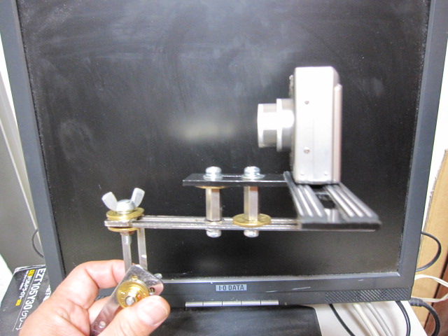 写真を拡大してみると画面の下部に蝶ねじの頭が見えます。
