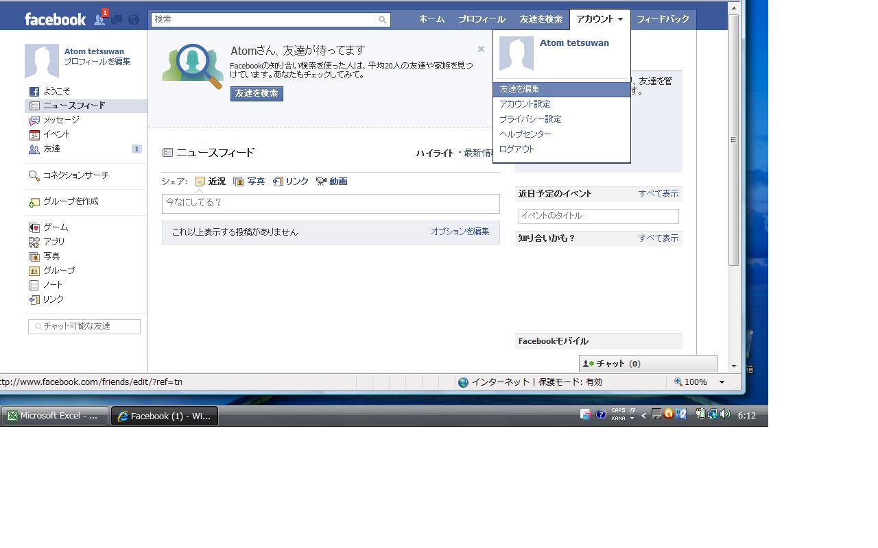 「ニュースフィールド」で右上の「アカウント」タグ、「友達を編集」をクリックします。