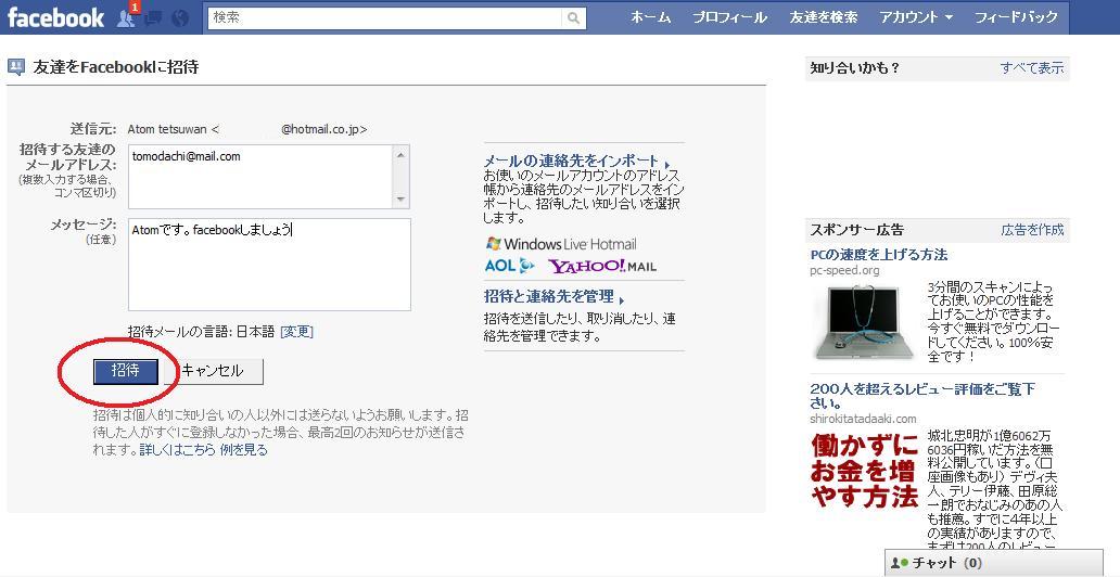 さあ、メルアドがわかれば友達をfacebookに招待しましょう