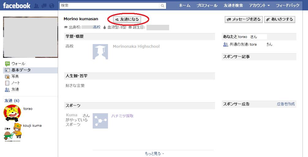 出身校などで知っている友達なら赤枠の「友達になる」ボタンをクリック。